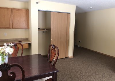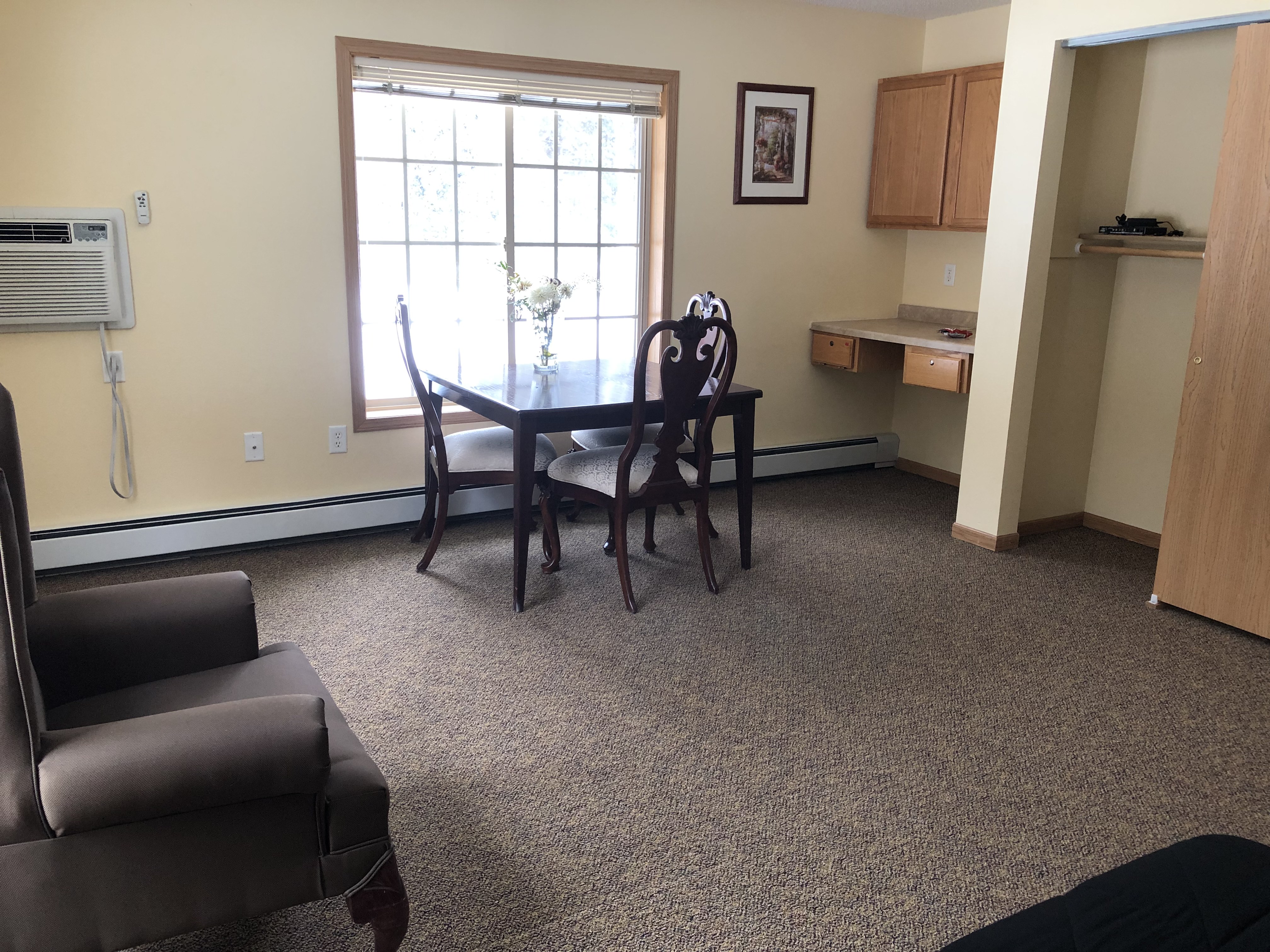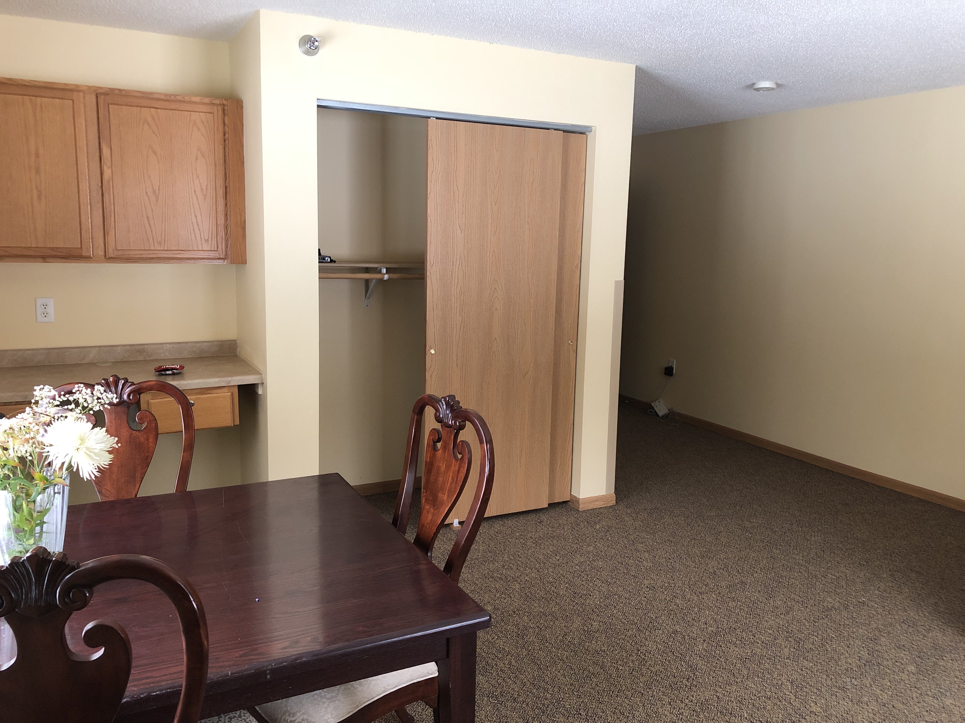 This apartment has a kitchenette with room for a small table, then a living room with enough room for a couch and two smaller chairs or two larger chairs with a smaller loveseat.