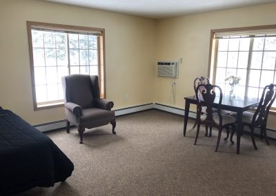 We have an option of four large, 350 sq. ft corner units with nice picture windows facing in two directions. This is a large unit – it is an Efficiency but enough room for a king or queen size bed, TV sitting area or table by one of the windows.